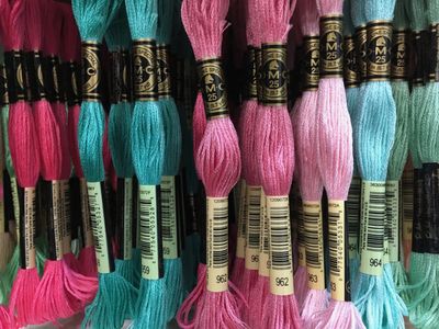 Embroidery floss is made of six separated strands that are wound into a large circle. Depending upon the desired thickness of your stitch, the 6 strands can be separated out individually then rejoined as 2,3,4,5 or 6 strands. DMC is a popular brand of stranded cotton floss and has a large range of colours and is of consistent quality. Floss is suitable for surface embroidery, needle painting such as satin stitch, cross stitch and counted thread sewing. Floss may be used with a Sharp Needle however if you wish to use more than a couple of strands, the larger eye of a Crewel needle may be more suitable. When cutting your floss to length, most people will measure out a length from finger tip to elbow. This is a manageable length. Strands should be drawn from the floss individually then rematched with other strands if using 2 or more strands.